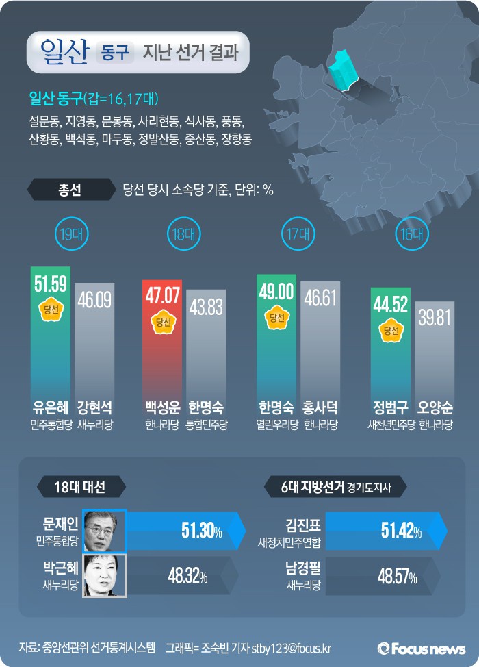 (서울=포커스뉴스) '경기 북부의 정치 1번지'로 불리는 경기 고양시 일산동구와 서구의 지난 선거 결과에서는 여당 후보와 야당 후보가 17, 18, 19대 총선에서 번갈아가며 당선됐다.