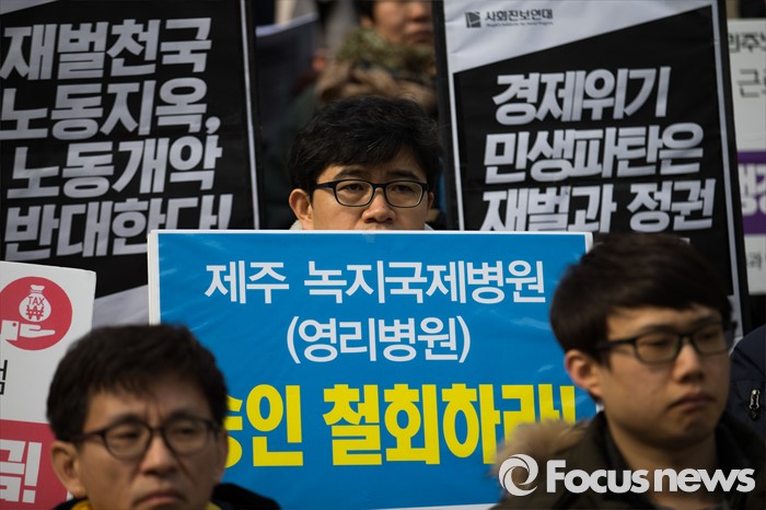 (서울=포커스뉴스) 29일 오전 서울 종로구 세종문화회관 앞에서 열린 '박근혜 정권 3년 평가 기자회견'에 참석한 전국민주노동조합총연맹 등 각 단체 조합원들이 손피켓을 들고 있다.