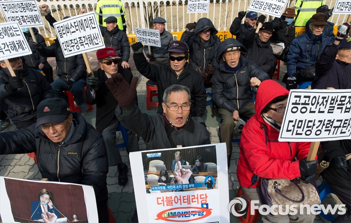 (서울=포커스뉴스) 25일 오전 서울 여의도 국회 앞에서 어버이연합을 비롯한 보수단체가 야당의 테러방지법 반대를 위한 무제한토론(필리버스터) 중단을 요구하며 기자회견을 하고 있다.