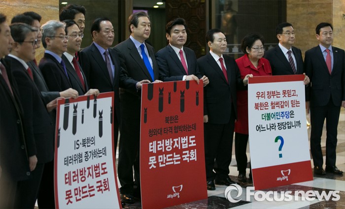 (서울=포커스뉴스) 테러방지법 직권상정에 반발해 야당의 무제한 토론(필리버스터)이 사흘째 진행되고 있는 25일 오전 서울 여의도 국회 본회의장 앞에서 김무성 새누리당 대표, 원유철 원내대표 등 지도부가 무제한 토론 비판 시위를 하고 있다.