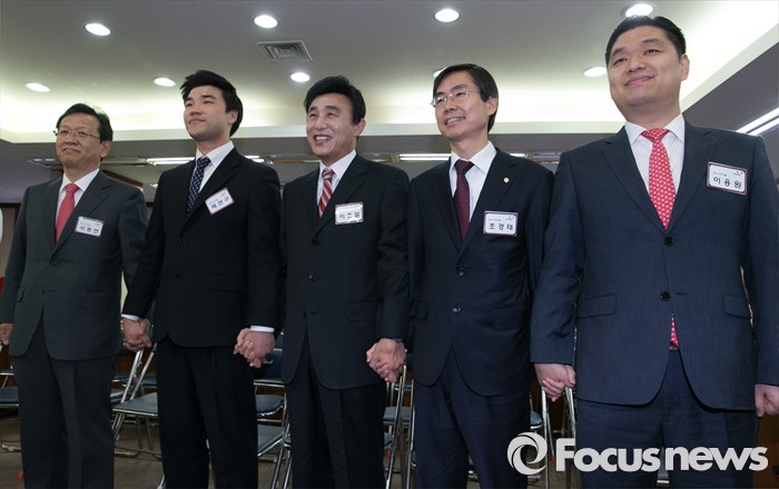 (서울=포커스뉴스) 25일 오전 서울 여의도 새누리당사에서 열린 20대 총선 공천 신청자 면접심사에 부산 사하을에 신청한 조경태 새누리당 의원과 예비후보들이 취재진을 향해 포즈를 취하고 있다. 왼쪽부터 석동현, 배관구, 이호열, 조경태, 이용원 예비후보.