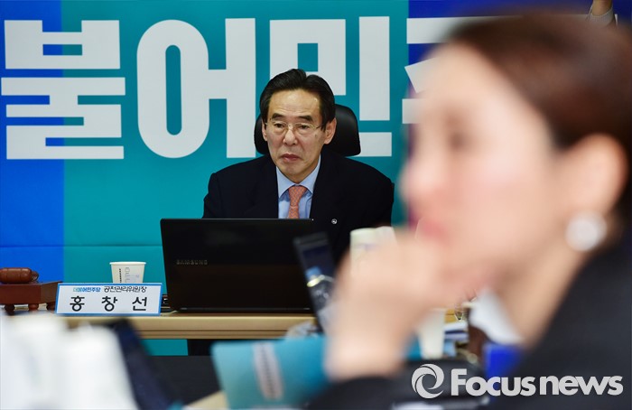 (서울=포커스뉴스) 25일 오전 서울 여의도 더불어민주당사에서 열린 20대 총선 공천 신청자 면접심사에 참석한 홍창선 공천관리위원장 등 위원들이 박영순, 고재일, 정현태 대전 대덕 예비후보에 대한 심사를 하고 있다.