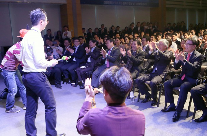 직장 배달 콘서트는 지금까지 총 40여 곳의 전국 직장인들의 근무현장을 찾아가 다양한 공연을 진행해 왔으며, 각 기업의 특징을 살린 기획 공연을 제공함으로써 경제 산업과 예술의 동반 성장을 도모하고 직장인들의 생활 속 문화 체험 확대를 유도한다는 점에서 기업과 직장인들의 큰 관심을 얻고 있다.김종덕 문화체육관광부 장관(앞줄 오른쪽 두번째)과 조용병 신한은행장(앞줄 오른쪽 첫번째) 등 신한은행 임직원 500여명이 24일 중구 태평로 소재 신한은행 본점 대강당에서 진행된 ‘문화가 있는 날, 직장 배달 콘서트’에서 타악 그룹 ‘공명’의 신명나는 공연을 관람하고 있는 모습.<사진제공=신한은행>