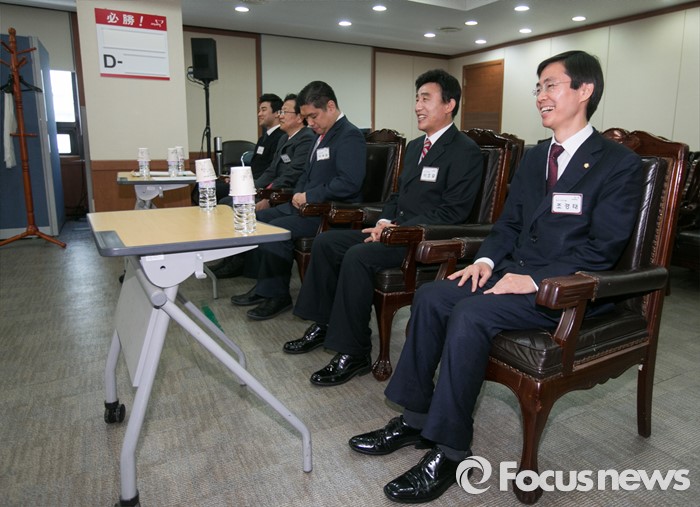 (서울=포커스뉴스) 25일 오전 서울 여의도 새누리당사에서 열린 20대 총선 공천 신청자 면접심사에 참석한 배관구(왼쪽부터), 석동현, 이용원, 이호열, 조경태 부산 사하을 예비후보가 공관위원들의 질문에 답하고 있다.