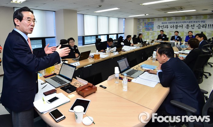(서울=포커스뉴스) 25일 오전 서울 여의도 더불어민주당사에서 열린 20대 총선 공천 신청자 면접심사에 참석한 홍창선 공천관리위원장이 박영순, 고재일, 정현태 대전 대덕 예비후보가를 심사하며 취재진에게 비공개 요청을 하고 있다.