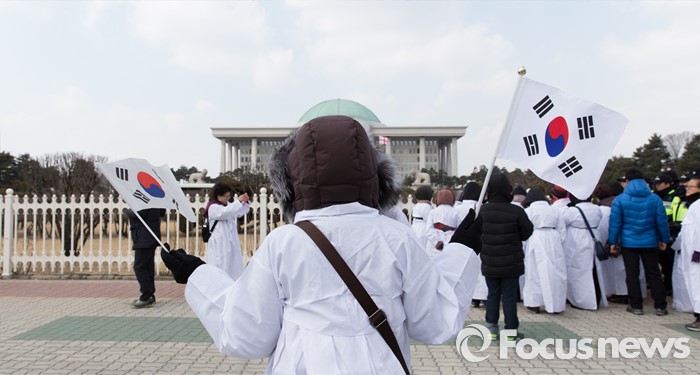 (서울=포커스뉴스) 25일 오후 서울 여의도 국회의사당 앞에서 엄마부대가 봉사단 회원들이 테러방지법을 반대하는 더불어민주당 규탄 기자회견을 하고 있다.