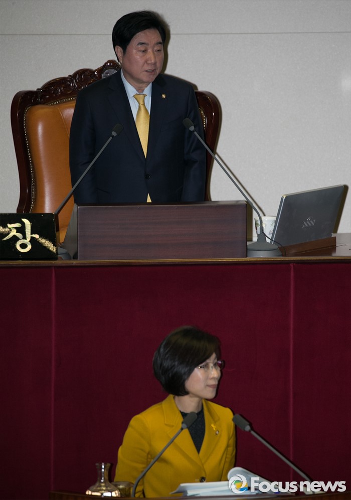 (서울=포커스뉴스) 테러방지법 직권상정에 반발해 야당의 무제한 토론(필리버스터)이 사흘째 진행되고 있는 25일 오후 서울 여의도 국회 본회의장에서 토론에 참여한 김제남(앞) 정의당 의원이 발언하던 중 이석현 국회 부의장이 의사진행 발언을 하고 있다.