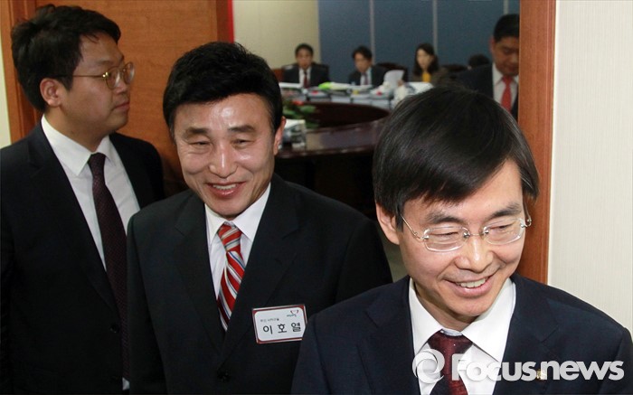 (서울=포커스뉴스) 25일 오전 서울 여의도 새누리당사에서 20대 총선 공천 신청자 면접심사를 마친 조경태(오른쪽), 이호열 부산 사하을 예비후보가 퇴장하고 있다.