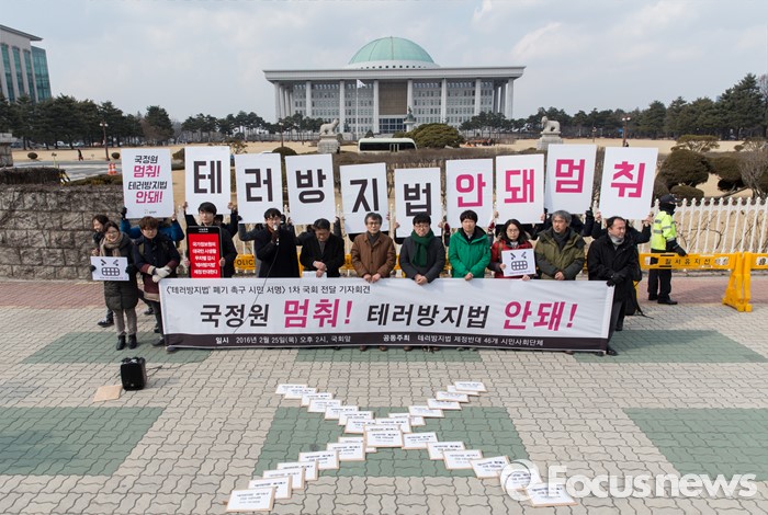 (서울=포커스뉴스) 25일 오후 서울 여의도 국회의사당 앞에서 테러방지법 제정을 반대하는 시민사회단체들이 테러방지법 폐기 촉구 30만 시민서명 국회전달 기자회견을 하고 있다.