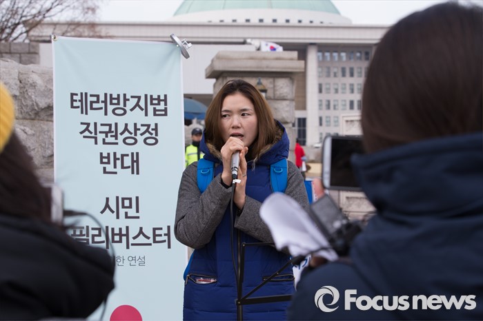 (서울=포커스뉴스)25일 오후 서울 여의도 국회의사당 앞에서 테러방지법을 반대하는 시민들이 무제한토론(필리버스터)에 참여하고 있다.