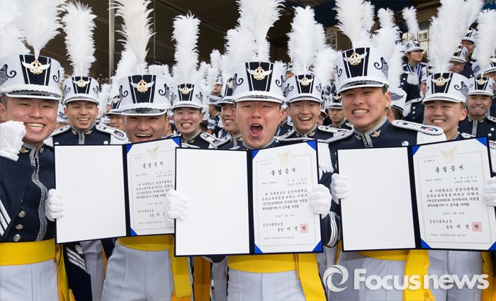 (청주=포커스뉴스) 25일 오후 충북 청주시 공군사관학교 연병장에서 열린 제64기 공군사관학교 졸업식에서 졸업생도들이 졸업장을 보이며 환호하고 있다.