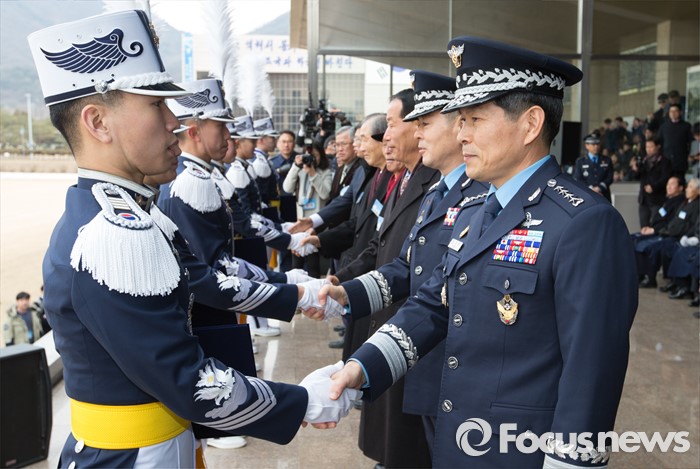 (청주=포커스뉴스) 25일 오후 충북 청주시 공군사관학교 연병장에서 열린 제64기 공군사관학교 졸업식에서 정경두 공군참모총장이 졸업생도와 악수를 하고 있다.