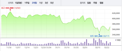 한정숙 현대증권 연구원은 “(중국과 한국관의 관계로 인한) 영향은 제한적이나 국내 기업들이 다소 불이익을 당하며, 중국에 대한 새로운 전략들을 구상하고 있다”며 “중국에 대한 의존도가 높은 국내 기업들은 경제보복에 대해 불안감이 높아지고 있는 시점”이라고 설명했다.아모레퍼시픽 주가흐름<사진출처=네이버 캡쳐>