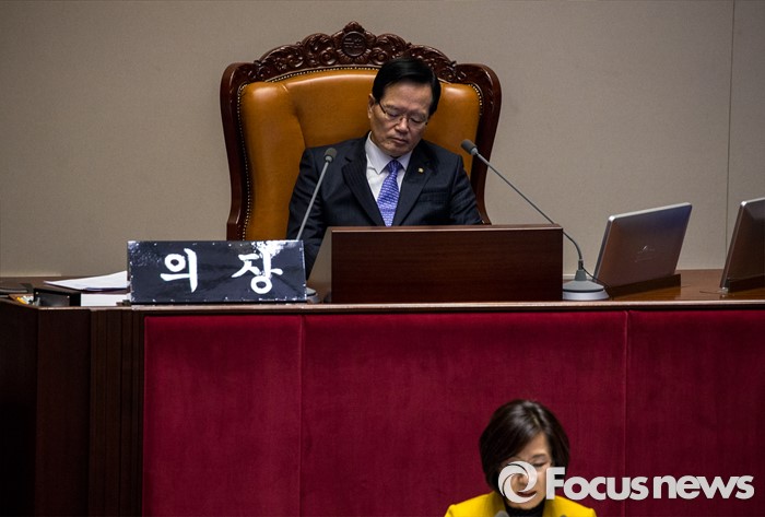 (서울=포커스뉴스) 테러방지법 직권상정에 반발해 야당의 무제한 토론(필리버스터)이 사흘째 진행되고 있는 25일 오후 서울 영등포구 국회 본회의장에서 김제남 정의당 의원이 발언을 하고 있다.