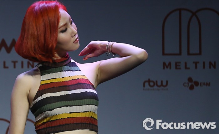 (서울=포커스뉴스) 25일 오후 서울 마포구 예스24 무브홀에서 열린 걸그룹 마마무의 정규 1집 'Melting' 쇼케이스에 참석한 멤버 화사가 머리카락을 정돈하고 있다.