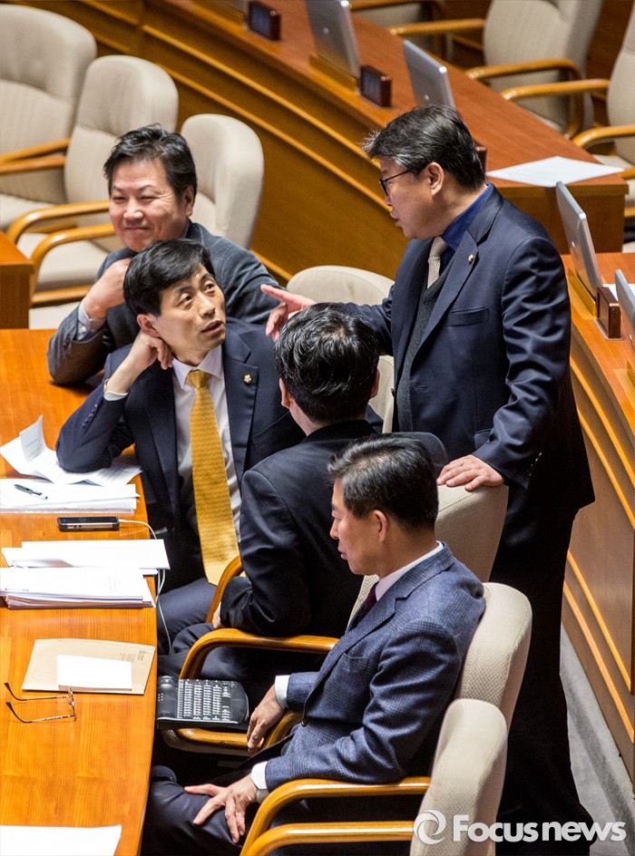| △ 야당 의원들과 대화 나누는 조원진 의원 |