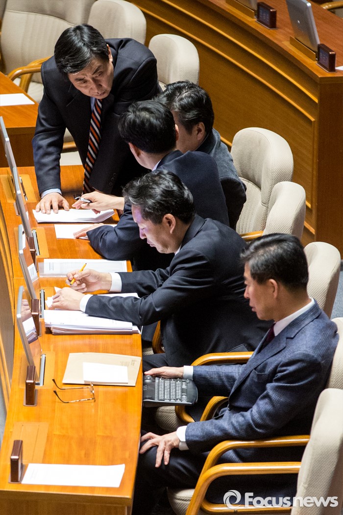 (서울=포커스뉴스) 테러방지법 직권상정에 반발해 야당의 무제한 토론(필리버스터)이 사흘째 진행되고 있는 25일 오후 서울 영등포구 국회 본회의장에서 이종걸 더불어민주당 원내대표가 동료 의원들과 대화를 나누고 있다.