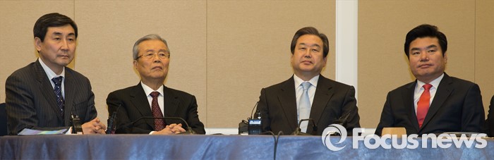 현행 국회법에 따르면 필리버스터가 중단되지 않으면 공직선거법 개정안을 처리할 수 없다.22일 오후 서울 여의도 국회에서 열린 '테러방지법 등 쟁점법안과 선거구 획정 논의를 마무리 짓기 위한 4+4 회동'에 이종걸(왼쪽부터) 더불어민주당 원내대표, 김종인 더불어민주당 비대위 대표, 김무성 새누리당 대표, 원유철 새누리당 원내대표가 참석하고 있다. 2016.02.22 조종원 기자