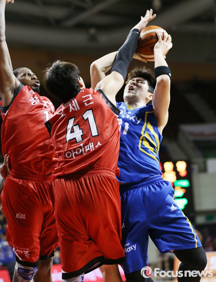 (안양=포커스뉴스) 25일 안양실내체육관에서 열린 2015-2016 프로농구 6강 플레이오프 KGC-삼성 1차전에서 KGC 오세근이 삼성 김준일의 골밑슛을 블로킹하고 있다.