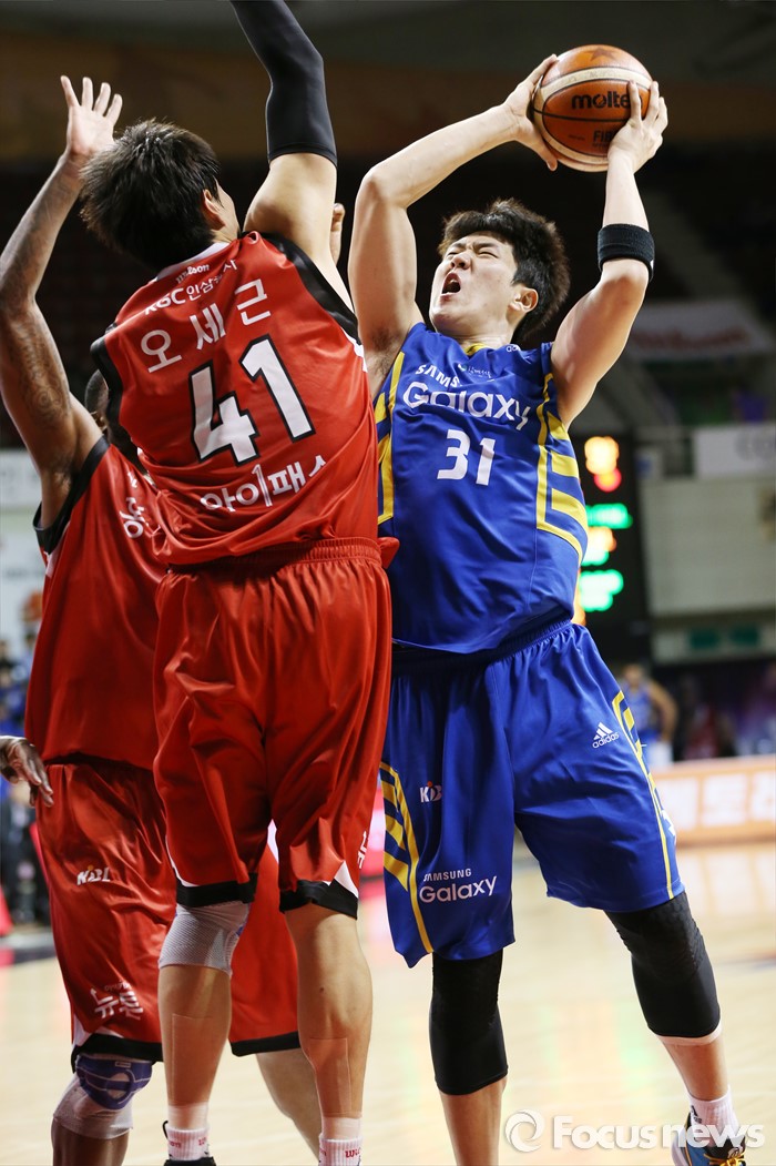 (안양=포커스뉴스) 25일 안양실내체육관에서 열린 2015-2016 프로농구 6강 플레이오프 KGC-삼성 1차전에서 KGC 오세근이 삼성 김준일의 골밑슛을 저지하고 있다.