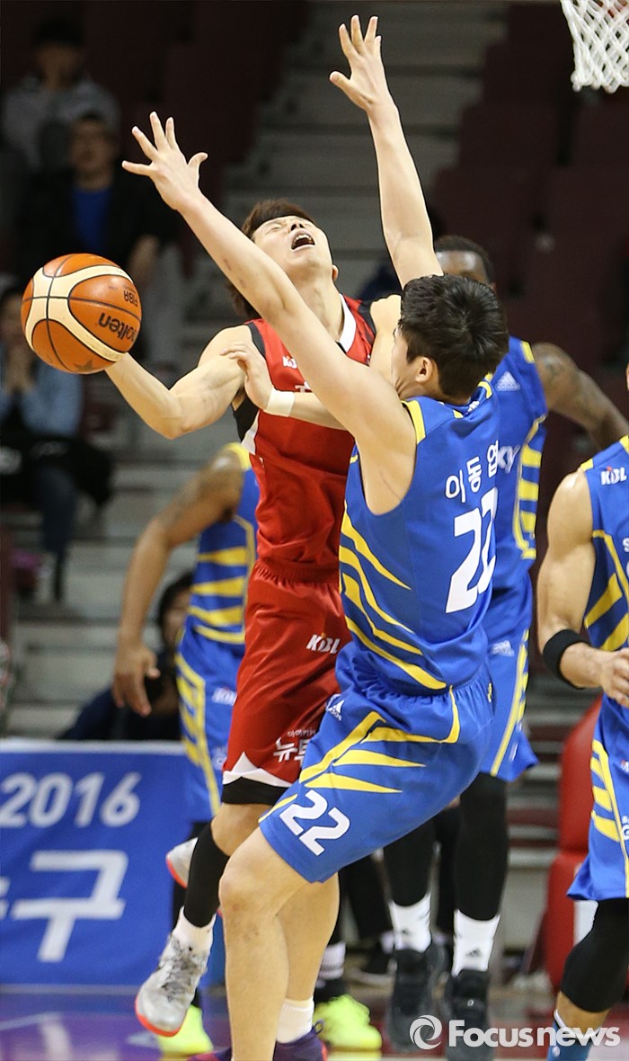 (안양=포커스뉴스) 25일 안양실내체육관에서 열린 2015-2016 프로농구 6강 플레이오프 KGC-삼성 1차전에서 KGC 김기윤이 드리블 돌파를 시도하다 삼성 이동엽과 충돌하고 있다.