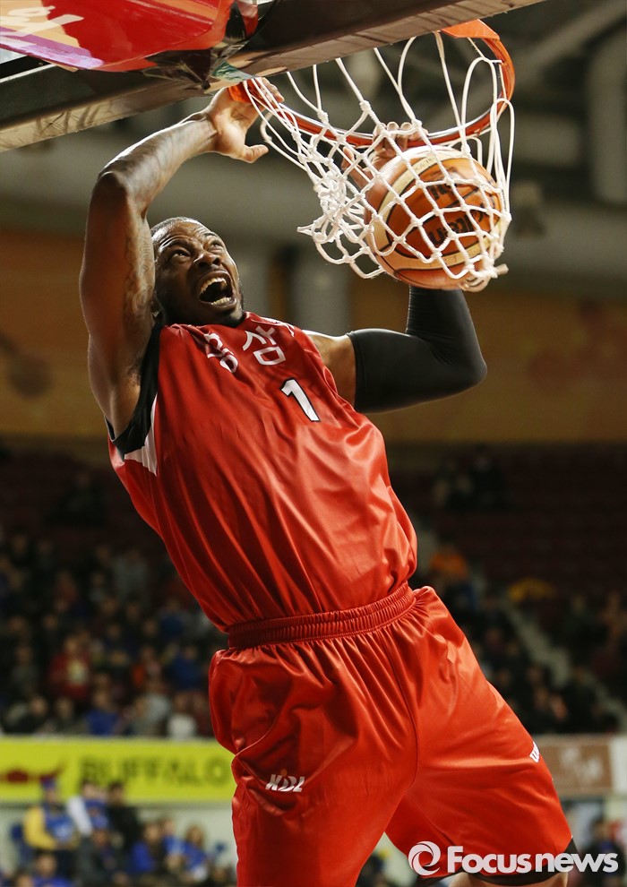 (안양=포커스뉴스) 25일 안양실내체육관에서 열린 2015-2016 프로농구 6강 플레이오프 KGC-삼성 1차전에서 KGC 찰스 로드가 이정현의 패스를 받아 엘리웁 덩크를 성공시키고 있다.