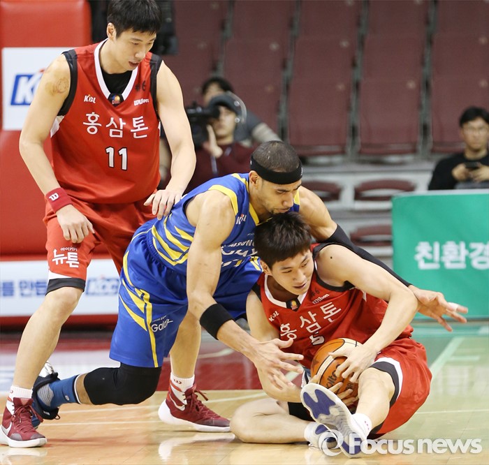 (안양=포커스뉴스) 25일 안양실내체육관에서 열린 2015-2016 프로농구 6강 플레이오프 KGC-삼성 1차전에서 삼성 문태영이 KGC 문성곤의 볼을 가로채려 달려들고 있다.
