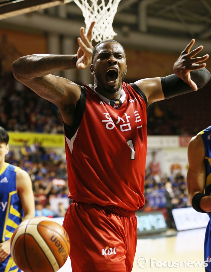 (안양=포커스뉴스) 25일 안양실내체육관에서 열린 2015-2016 프로농구 6강 플레이오프 KGC-삼성 1차전에서 KGC 찰스 로드가 이정현의 패스를 받아 엘리웁 덩크를 성공시키고 포효하고 있다.