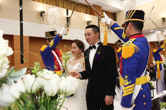 (서울=포커스뉴스) 몽골에서 온 옥타브르 수탁생도가 25일 서울 육군사관학교 졸업식을 마친 뒤 동갑내기 몽골인 신부 난딘체첵 씨와 결혼식을 올리고 있다. <사진제공=육군>