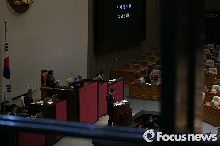 (서울=포커스뉴스) 테러방지법 직권상정에 반발해 야당의 무제한 토론(필리버스터)이 나흘째 진행되고 있는 26일 오전 서울 여의도 국회 본회의장에서 토론에 참여한 김경협 더불어민주당 의원이 발언하고 있다.