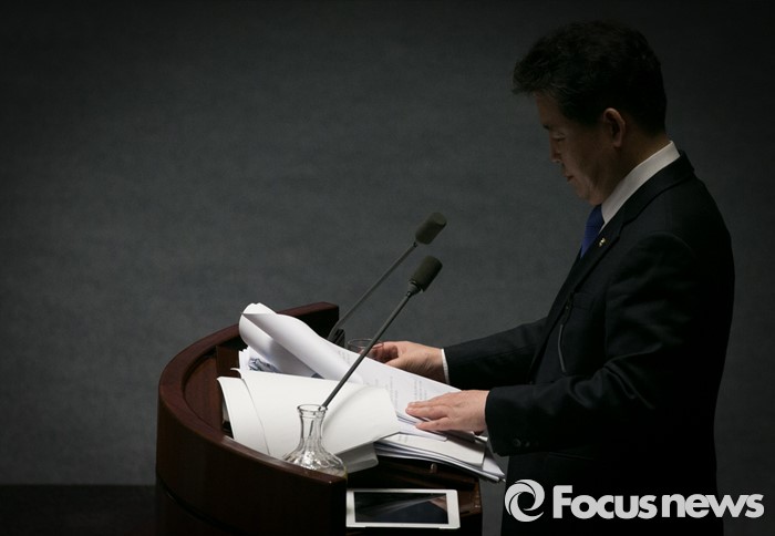 (서울=포커스뉴스) 테러방지법 직권상정에 반발해 야당의 무제한 토론(필리버스터)이 나흘째 진행되고 있는 26일 오전 서울 여의도 국회 본회의장에서 토론에 참여한 김경협 더불어민주당 의원이 발언하고 있다.
