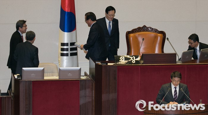 (서울=포커스뉴스) 테러방지법 직권상정에 반발해 야당의 무제한 토론(필리버스터)이 나흘째 진행되고 있는 26일 오전 서울 여의도 국회 본회의장에서 정의화 국회의장과 정갑윤 국회 부의장이 교대하고 있다.