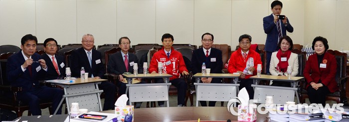 (서울=포커스뉴스) 26일 오전 서울 여의도 새누리당사에서 열린 20대 총선 공천 신청자 면접심사에 참석한 대구 중구남구 예비후보들이 면접 시작을 기다리고 있다. 곽상도, 김휘일 예비후보, 김희국 의원, 남달구, 남창모, 배영식, 이상목, 이인석, 조명희 예비후보.