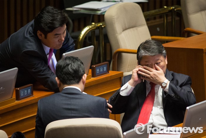 | △ 필리버스터 나흘째, 은밀히 통화하는 조원진과 원유철 |