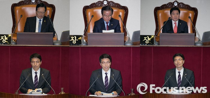 (서울=포커스뉴스) 테러방지법 직권상정에 반발해 야당의 무제한 토론(필리버스터)이 나흘째 진행되고 있는 26일 오전 서울 여의도 국회 본회의장에서 토론에 참여한 서기호 정의당 의원의 발언 중 국회의장단이 당직교대를 했다. 왼쪽부터 정의화 국회의장, 정갑윤, 이석현 국회 부의장.