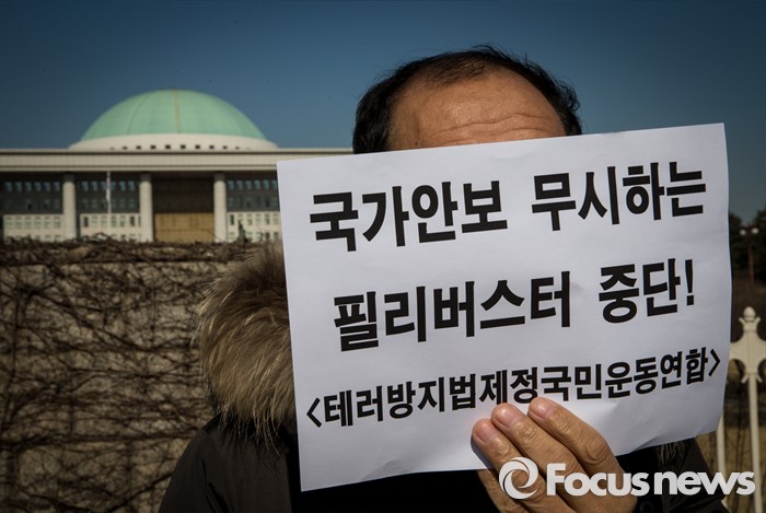 (서울=포커스뉴스) 26일 오전 서울 여의도 국회 정문 앞에서 보수단체 회원이 테러방지법 제정을 요구하는 손팻말을 들고 있다.