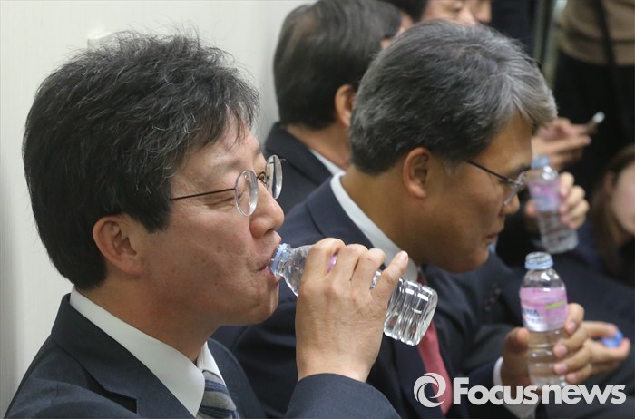 (서울=포커스뉴스) 26일 오전 서울 여의도 새누리당사에서 열린 20대 총선 공천 신청자 면접심사에 참석한 유승민(왼쪽), 이재만 대구 동구을 예비후보가 면접을 기다리며 물을 마시고 있다.