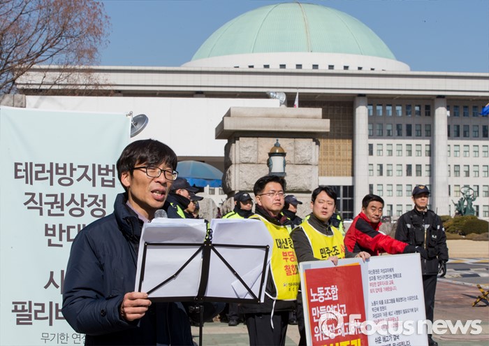 (서울=포커스뉴스) 26일 오전 서울 여의도 국회 정문 앞에서 송상교 민변 변호사가 테러방지법 직권상정 반대 시민 필리버스터를 이어가고 있다.