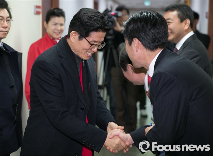 (서울=포커스뉴스) 26일 오후 서울 여의도 새누리당사에서 열린 20대 총선 공천 신청자 면접심사에 참석한 김문수 대구 수성갑 예비후보가 다른 예비후보들과 인사하고 있다.