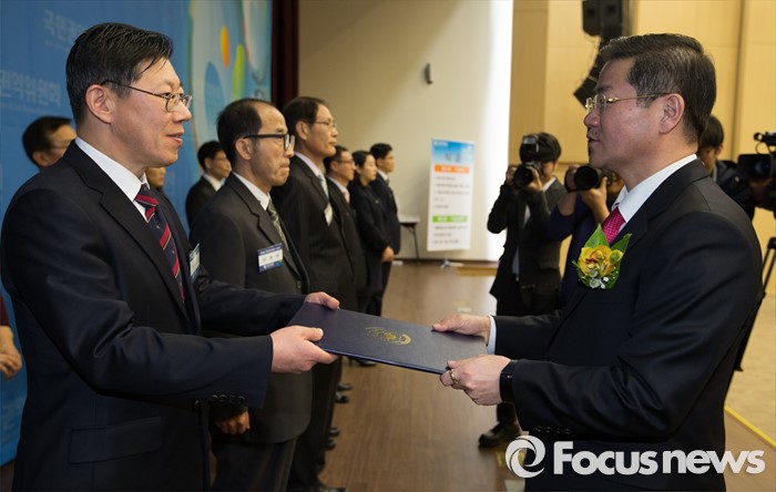 (세종=포커스뉴스) 26일 오후 세종시 정부세종컨벤션센터에서 열린 제4회 국민권익의 날 기념식에서 성영훈 국민권익위원장이 이영구 전 국민권익위원회 비상임위원에게 국민훈장동백장을 전달하고 있다.