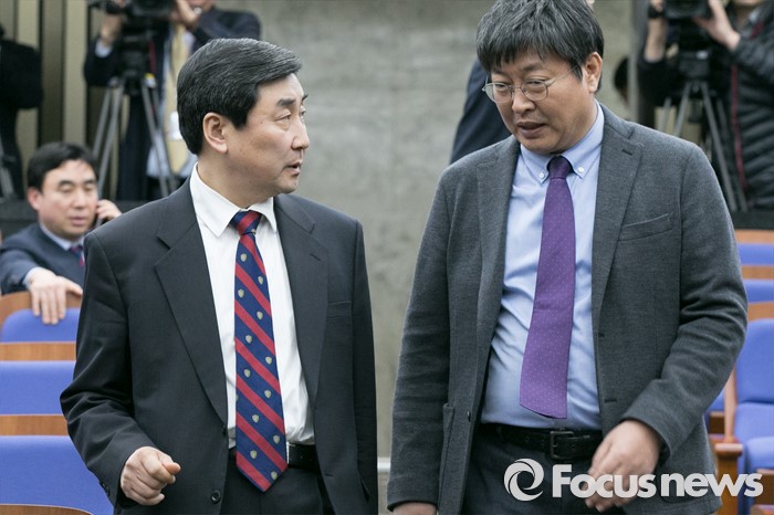 (서울=포커스뉴스) 이종걸(왼쪽) 더불어민주당 원내대표와 이춘석 원내수석부대표가 26일 오후 서울 여의도 국회에서 열린 의원총회에 참석하며 대화하고 있다.