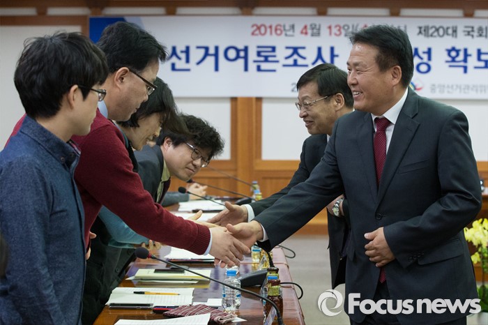 (과천=포커스뉴스) 김신기 선거정책실장이 26일 오후 경기도 과천시 중앙선거관리위원회에서 열린 선거여론조사 공정성 확보 대책회의에서 정당관계자들과 주요 여론조사업체 대표들과 인사하고 있다.
