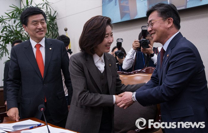 (서울=포커스뉴스) 나경원 외통위원장과 홍용표(오른쪽) 통일부 장관이 26일 오후 서울 여의도 외교통일위원회 전체회의에서 박근혜 정부의 국정 핵심 법안 중 하나인 북한 인권법을 의결한 뒤 악수를 나누고 있다.