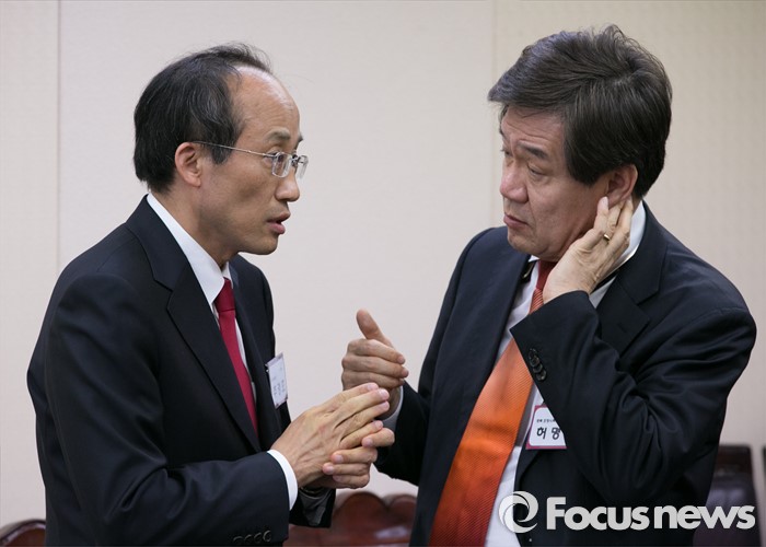 (서울=포커스뉴스) 26일 오후 서울 여의도 새누리당사에서 열린 20대 총선 공천 신청자 면접심사에서 대구 달성군에 신청한 추경호(왼쪽) 전 국무조정실장과 허명환 경북 포항북구 예비후보가 면접을 기다리며 대화하고 있다.