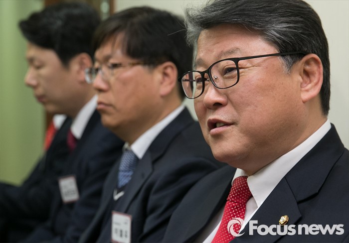 (서울=포커스뉴스) 26일 오후 서울 여의도 새누리당사에서 열린 20대 총선 공천 신청자 면접심사에 참석한 조원진(오른쪽 첫번째) 원내수석부대표가 면접을 기다리며 야당의 필리버스터와 관련 취재진 질문에 답하고 있다. 조 의원은 대구 달서병에 신청했다.