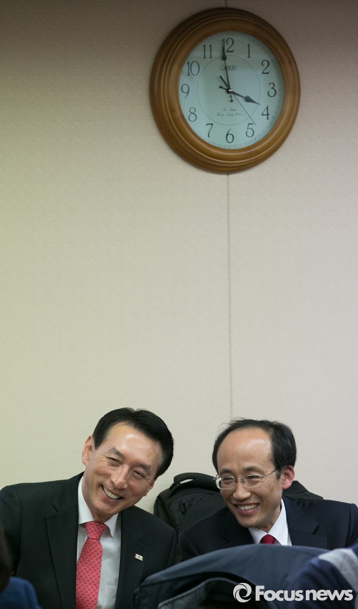 (서울=포커스뉴스) 26일 오후 서울 여의도 새누리당사에서 열린 20대 총선 공천 신청자 면접심사에 참석한 김석기(왼쪽) 경북 경주 예비후보와 추경호 대구 달성군 예비후보가 면접을 기다리며 대화하고 있다.