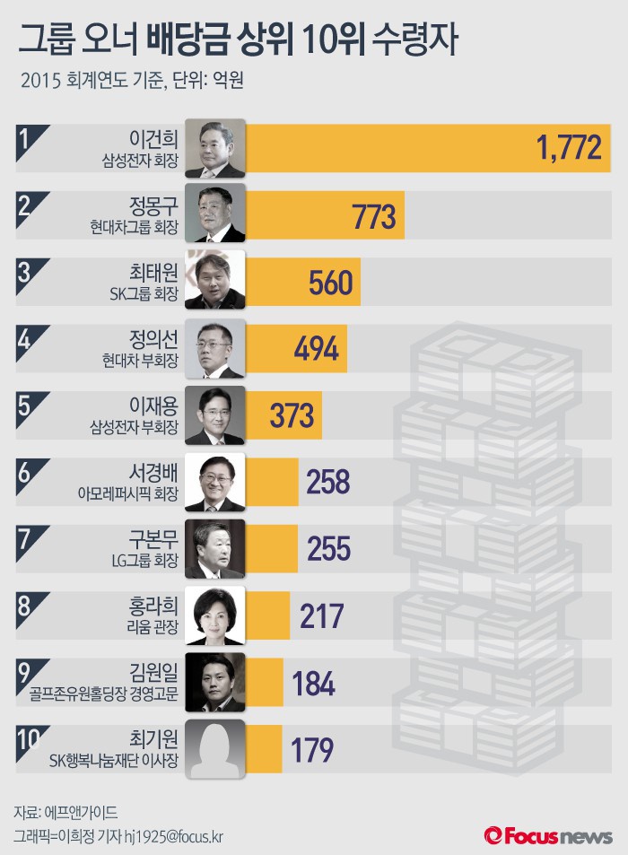 (서울=포커스뉴스) 26일 금융정보업체 에프앤가이드가 지난 24일까지 공시된 상장사 현금 배당(보통주 기준) 현황을 집계한 결과 이건희 회장은 1772억원으로 1위를 기록했다.