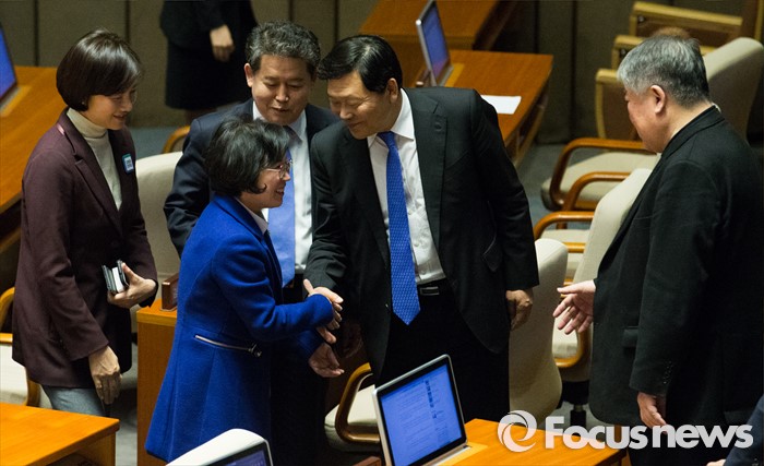 (서울=포커스뉴스) 테러방지법 직권상정에 반발해 야당이 무제한 토론(필리버스터)를 나흘째 진행하고 있는 26일 오후 서울 여의도 국회 본회의장에서 김현(왼쪽 두번째) 더불어민주당 의원이 토론을 마친 뒤 동료 의원들의 격려를 받으며 퇴장하고 있다.