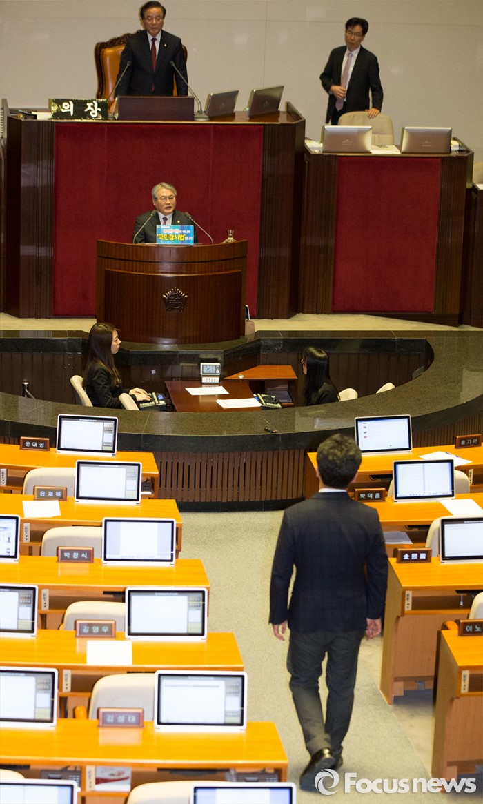 (서울=포커스뉴스) 테러방지법 직권상정에 반발해 야당의 무제한 토론(필리버스터)이 진행되고 있는 26일 오후 서울 여의도 국회 본회의장에서유의동 새누리당 원내대변인이 토론을 진행중인 김용익 더불어민주당 의원을 향해 항의하기 위해 나서고 있다.