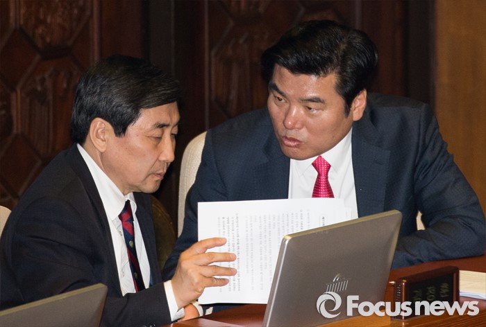 (서울=포커스뉴스) 테러방지법 직권상정에 반발해 야당이 무제한 토론(필리버스터)를 나흘째 진행하고 있는 26일 오후 서울 여의도 국회 본회의장에서 원유철(오른쪽) 새누리당 원내대표와 이종걸 더불어민주당 원내대표가 대화를 나누고 있다.